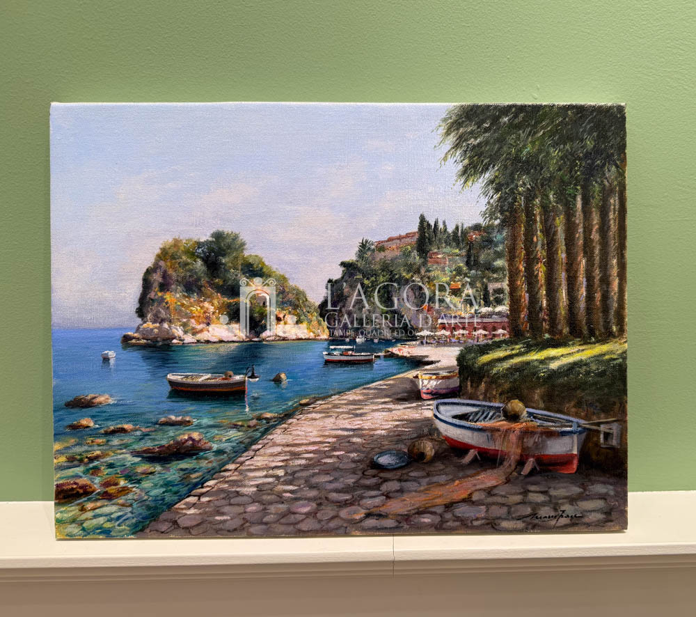Tonalità e luce mediterranee, caratterizzano i dipinti del maestro Mario Irace. Veduta della Baia delle Sirene a Taormina