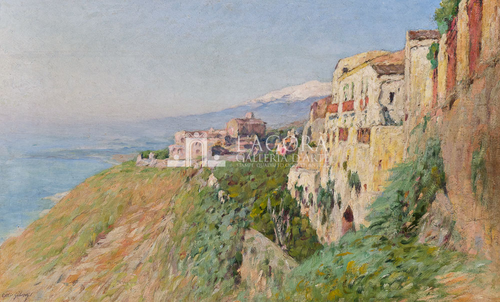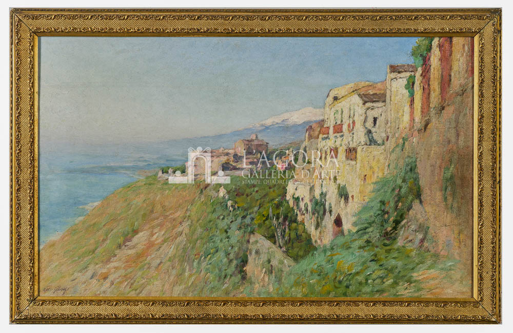 Apprezziamo in questo olio su tavola sagomata la rappresentazione bucolica del paesaggio. Il fascino della Taormina di un tempo. La minuziosità dei particolari nel ritrarre la tanto amata Taormina e la maestosità dell’ Etna innevata.